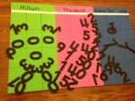 So tonight I brought out the Big Kahuna, the Billy Baroo (think Caddyshack) of math tools….the Million Board. I specifically made this board big with bright colors and moveable foam numbers for my little creative princess. In one short lesson, she learned how to say any number in the millions (213,875,909 for example). She also learned how to add two numbers that were in the millions (we don’t carry yet). I was ecstatic with the ease that she learned these concepts.